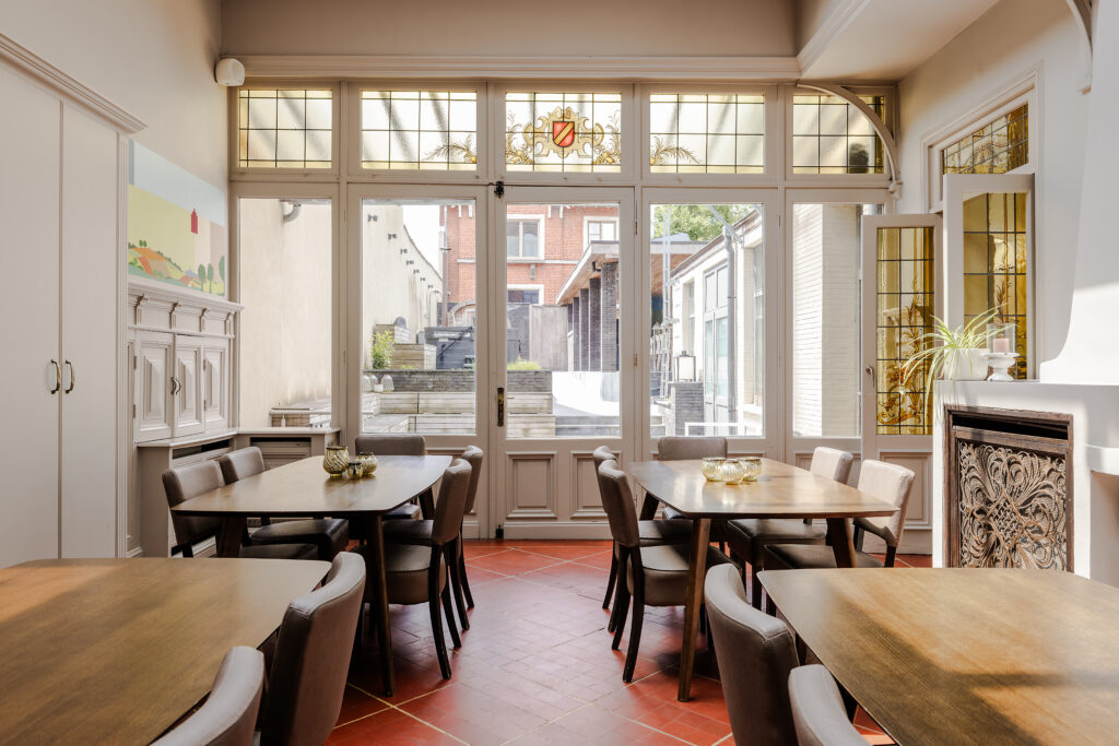 - Ruimte met 4 tafels en 24 stoelen, multifunctioneel, kan als vergaderruimte en als eetzaal gebruikt worden
